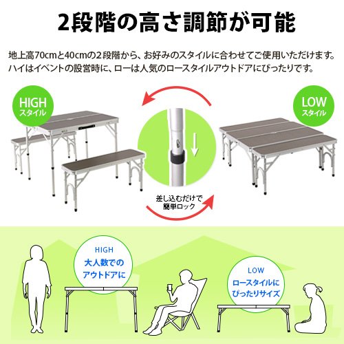 テーブルの高さは二段階にして活用することが可能です。小さなお子様がいるご家庭の方はローテーブルにして、子供の目線の高さに合わせて活用出来ます。アルミ製でありながらベンチの耐荷重は140kgまでと堅牢な設計となっていますので安心してピクニックで活用することが出来ます。
