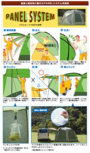 ●組立て3分 ●前面はアーチ型フレームパーツを交差させ強度・居住性を兼ね備えたPANELシステム採用 ●テント内テーブルの配列がしやすい長方形 ●車体連結可能(連結用ジョイント付き/2個) ●キャノピーポールパーツ付き