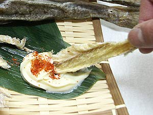 この状態のものを「かんかい」と称され売られています。そのままでは硬くて食べれないため、木槌などでたたき、あぶって、手でむしりながら七味とマヨネーズなどで食べると絶品です。味にくせがあるので好き嫌いが分かれますが、お酒のあてとしてリピート率が高く人気があります。