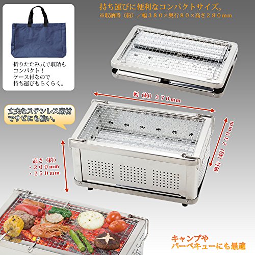 使用時サイズ:約51cm×52cm(炭床引き出し時)×高さ(脚ポール調節にて40cmまたは70cm) 収納時サイズ:約50cm×34cm×高さ15cm 重さ:約5.5kg