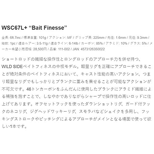 ワイルドサイド【WSC67L+ “Bait Finesse”】は、フィネスな釣りでバスを誘いたいけど、パワーも欲しい時に最適なロッドです。ワイルドサイドWSC64L “Bait Finesse”よりも少しだけ長めのロッドではピッチングがしやすく、ジグヘッドワッキーやネコリグなどの感度が必要なフィネスな釣りをカバーなどに撃ち、バスを釣りあげることが出来ます。スピニングタックルでセッティングするような感度が必要なフィネスな釣りがしたいけど、パワーも必要だというときにおすすめのロッドです。アラミド繊維でブランクを補強することでしなやかさと操作性を兼ね備えています。