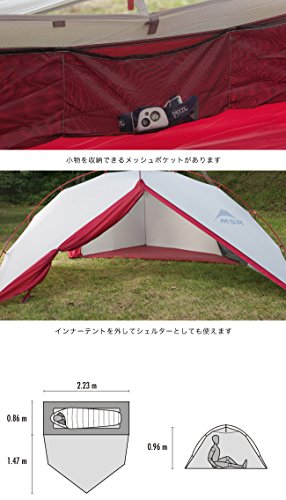 平均重量:1,400g 設営サイズ:220×86cm×高さ86cm 収納サイズ:56×15cm キャノピー:75Dポリエステル/40Dメッシュ フロア:68Dポリエステルタフタ(3,000mmPU) フライシート:75Dポリエステル(1,200mmPU)