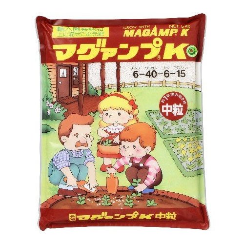 「マグアンプ」の一粒一粒には、水に溶ける成分と溶けない成分が含有されています。水やりや雨などではじめに肥料のなかの水に溶ける成分がいきわたります。そのあと水に溶けない成分が、微生物や植物の根っこによりゆるやかに溶けはじめます。そのため一度肥料を施すとゆっくりと2カ月効果があると言われています。マグアンプには小粒、中粒、大粒タイプがあります。