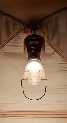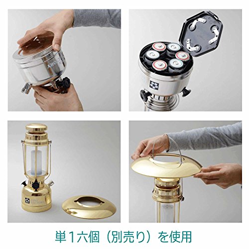 光のムラを最小限に抑えるストライプトップカバーが付いています。そのストライプトップカバーを取り外して、テント内に吊るして照らすのでとても明るいです。使用電池は、単1形アルカリ電池×6本を使います。