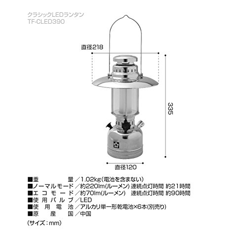 暖色の明かりで一層盛り上げます。小型でコンパクトで、サブランタンとして十分な約220ルーメンの光量です。使用電源は単一乾電池×6本で、連続点灯時間はノーマルモードで約21時間、エコモードで約90時間と長時間使用できます。