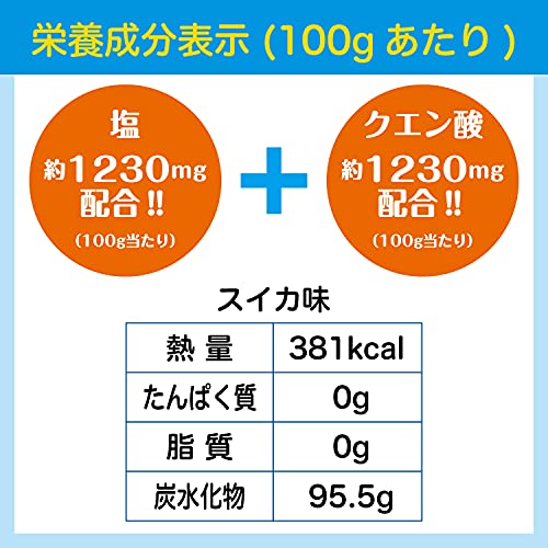 熱い体にうれしい塩分補給をしてくれます。 味はマスカット、レモン、スイカ味の3種類です。 おいしいのでおすすめです。