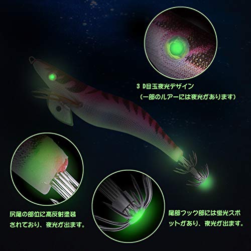 このエギセットは蛍光に発光、夜光などの様々な種類のエギに、更にエギを入れるケースまで付いた入門に最適の一品です。
