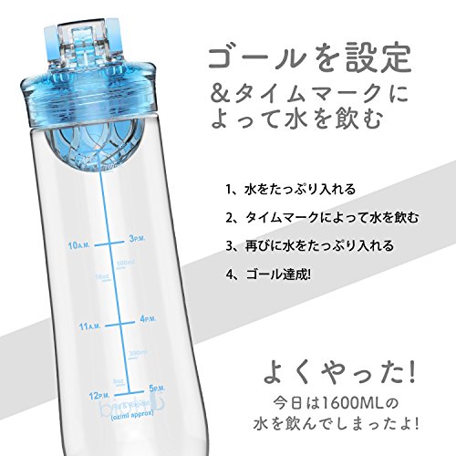 使い方もシンプルで、ウォーターボトルの本体外側には目盛りと時間が付いていますので、それに従って効率的に水分補給を行う事ができます。広口の口径となっていますのでカットしたフルーツや野菜類も入れやすく大容量なウォーターボトルです。取っ手備わっていて、重量も177gと軽量なウォーターボトルなので持ち運びにも便利です。