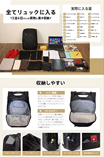 出典: https://www.amazon.co.jp/ROMOSS-%E5%85%85%E9%9B%BB%E3%83%9D%E3%83%BC%E3%83%88-PC%E3%83%91%E3%82%BD%E3%82%B3%E3%83%B3-%E3%83%90%E3%83%83%E3%82%AF%E3%83%91%E3%83%83%E3%82%AF-%E3%83%AC%E3%83%87%E3%82%A3%E3%83%BC%E3%82%B9/dp/B072XFHGYN/ref=sr_1_24?ie=UTF8&qid=1528353562&sr=8-24&keywords=%E9%80%9A%E5%8B%A4%E3%80%80%E3%83%AA%E3%83%A5%E3%83%83%E3%82%AFパソコンとスピーカーやプリンター(Canonのモバイルプリンター)を全て入れて旅先で使うために買いました。 いろいろ入れてしまったら、着替えとかは無理かな。 プリンターのみなら1泊分の着替えは入りそうかな。 あんまり無理せずに通勤用に使うと良いと思います。素材や形は良いと思いますし、普段はリュック様の肩紐を収納して手持ちするのが良いですね。 しばらく使ってみて耐久性を確認したいと思います。