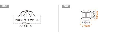 材質 / タープ / 75Dポリエステルタフタ〈UVPRO,PU防水,シームシール〉,ポール / アルミ合金〈直径19mm〉,アルミ合金〈直径16mm〉,アルミ合金〈直径14.5mm〉,スチール〈直径19mm〉,キャノピー / 180cm