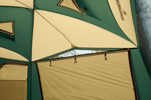 背面にテントと連結出来るフラップが備わっています。サイドの片面部分には完全に締め切った状態で、出入りする事が出来る便利なドアも付いています。雨天時でも安心して中で過ごせる耐水圧に優れている生地を採用しています。雨漏りなどの心配もなく快適に過ごす事ができます。