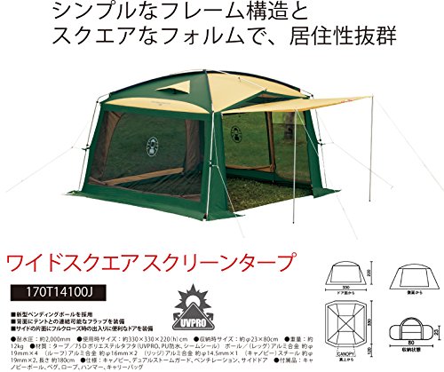 出典: https://www.amazon.co.jp/%E3%82%B3%E3%83%BC%E3%83%AB%E3%83%9E%E3%83%B3-Coleman-170T14100J-%E3%82%BF%E3%83%BC%E3%83%97-%E3%83%AF%E3%82%A4%E3%83%89%E3%82%B9%E3%82%AF%E3%82%A8%E3%82%A2%E3%82%B9%E3%82%AF%E3%83%AA%E3%83%BC%E3%83%B3%E3%82%BF%E3%83%BC%E3%83%97/dp/B001SJR5EG/ref=sr_1_26?s=sports&ie=UTF8&qid=1529272895&sr=1-26&keywords=%E3%82%B3%E3%83%BC%E3%83%AB%E3%83%9E%E3%83%B3%E3%80%80%E3%82%B9%E3%82%AF%E3%83%AA%E3%83%BC%E3%83%B3念願の本商品を購入しました。ポールが垂直に近く立つため、とにかく広い。ただし、箱型形状のため風に弱いという口コミを拝見していたので、いかがなものかと多少不安はありましたが、今のところ、多少激しい夕立も難なく耐えています。