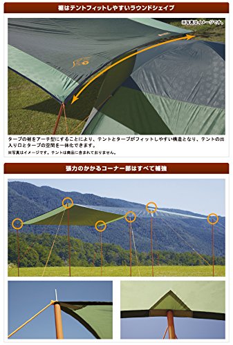 タープの裾部分をアーチ状にする事により、別売されているテントとフィットさせて設営できますので、テントの出入り口とタープを一緒に活用出来ます。タープの紐の繋ぎ目部分が補強されていますので、破損しにくく長く愛用できます。また耐風性にも優れているタープになりますので、風の吹き荒れる日でも活用できます。