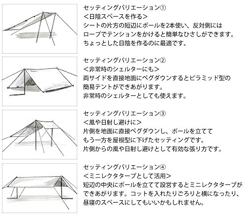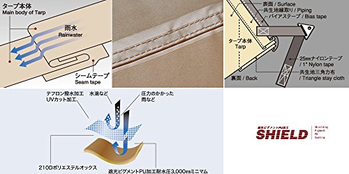 他にも、シールド加工が施されているタープになりますので、生地を通す光を軽減してくれますので、夏のキャンプや登山などのアウトドアシーンの際に、体感温度が低くなり、涼しく快適に過ごせるタープです。