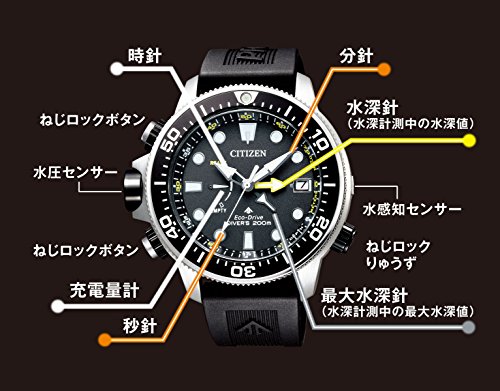 防水機能:200潜水用防水 搭載機能:秒針停止、日付早修正、衝撃検知、充電量表示、充電警告機能、過充電防止、水深計測、最大水深表示、水感知、急浮上警告、