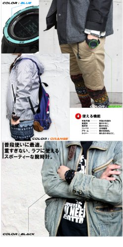 防水性能:100m防水 駆動方式:電池式 搭載機能:気圧計、高度計、歩数・消費カロリー等の計測管理、デジタルコンパス、気温表示、天気予測、アラーム、カウンドダウンタイマー、ワールドタイム、ELバックライト、パワーセーブ