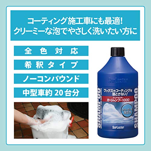 出典: https://www.amazon.co.jp/%E3%82%B7%E3%83%A5%E3%82%A2%E3%83%A9%E3%82%B9%E3%82%BF%E3%83%BC-%E3%83%8E%E3%83%BC%E3%82%B3%E3%83%B3%E3%83%91%E3%82%A6%E3%83%B3%E3%83%89-%E3%82%AB%E3%83%BC%E3%82%B7%E3%83%A3%E3%83%B3%E3%83%97%E3%83%BC1000-SurLuster-S-30/dp/B002Y06MOC/ref=sr_1_4?ie=UTF8&qid=1529711887&sr=8-4&keywords=%E3%82%AB%E3%83%BC%E3%82%B7%E3%83%A3%E3%83%B3%E3%83%97%E3%83%BC%E3%80%80%E3%82%B3%E3%83%BC%E3%83%86%E3%82%A3%E3%83%B3%E3%82%B0「たいした違いはないだろう」と、これまでカー用品店でよくあるシャンプーを購入していましたが、評判通り泡立ちが全く違います。特に冬で水温が低いと、いくらバケツに水流で泡立てても、これまでのシャンプーはあっという間に泡がなくなりますが、これは最後の方まで泡が持続します。洗車が楽しくなりますよ。
