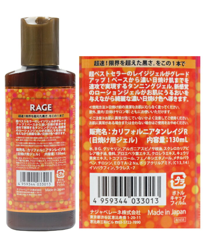 日焼けにおすすめのサンオイルランキング3位は、「カリフォルニアタンのレイジジェル」です。こちらは既に日焼けしている方が、更に濃い日焼けを目指す為に作られたもの。ですので、使い方には要注意です。他のサンオイルでは中々綺麗に焼けてくれなかった、もっと濃く焼きたいという方は是非使ってみましょう!ダークなブロンズ肌になりたい方におすすめです!