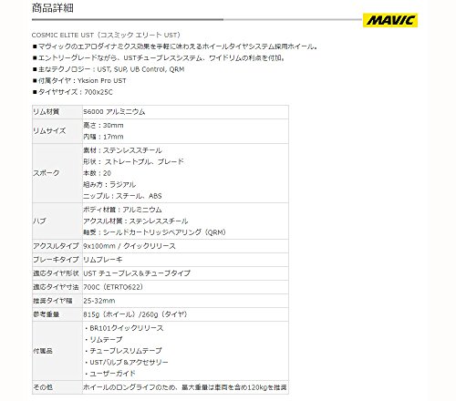 ■マヴィックのエアロダイナミクス効果を手軽に味わえるホイールタイヤシステム採用ホイール。■主なテクノロジー:UST, SUP, UB Control, QRM◆リム材質:S6000アルミニウム◆リムサイズ-高さ:30mm、内幅:17mm◆スポーク-素材:ステンレススチール、形状:ストレートプル、ブレード、本数:20◆ハブ:ボディ材質-アルミニウム、アクスル材質-ステンレススチール◆適応タイヤ寸法:700C(ETRTO622)◆推奨タイヤ幅:25-32mm