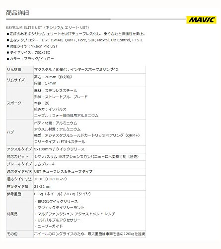 【MAVIC】(マビック)キシリウム エリート UST【ブラック/イエロー】チューブレスホイール リア用(シマノ/スラム)【自転車 パーツ】2006403990014