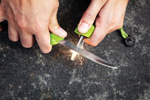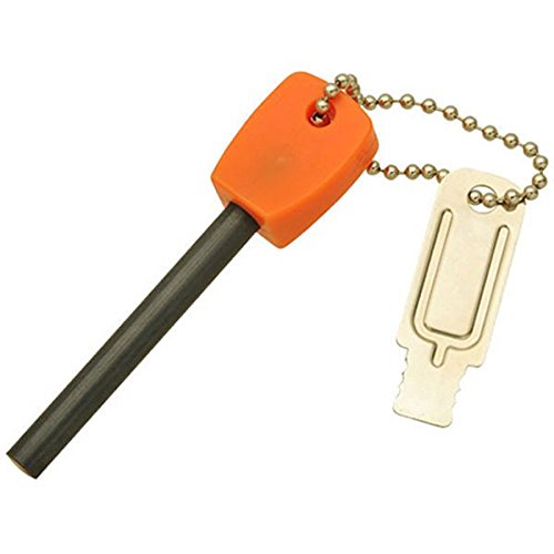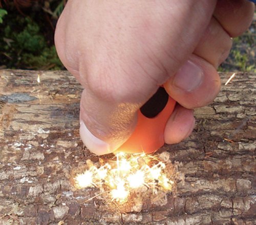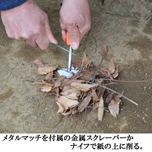 ケース付きのステンレスブレードなどで合金を紙や枯葉などの燃えやすいものに向かってこすり火花を起こして着火させることができます。ライターやマッチとは違い、水に強く酸素と結合しやすいため、高所や雨天、風圧のもとでも点火することができます。