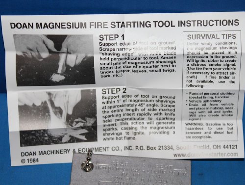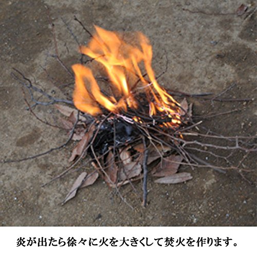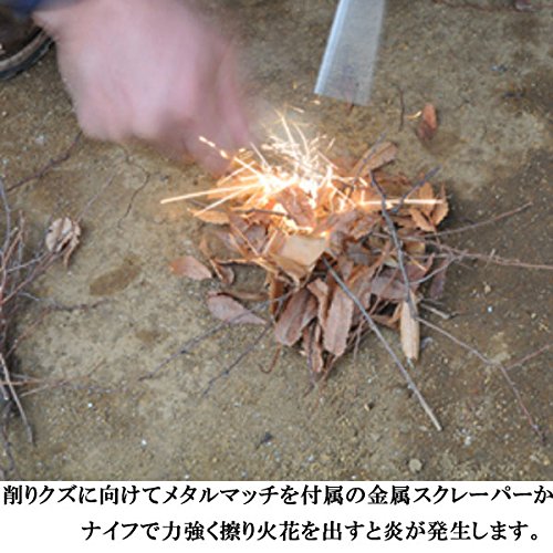 ケースについてあるステンレスブレードやナイフの背などでマグネシウム合金をティッシュや枯葉などの燃えやすいものに向かって擦り火花を発生させ引火させることで点火させることができます。