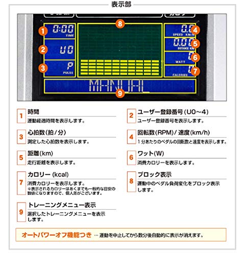 その他:メーター表示は「速度、走行距離、運動時間、カロリー消費量、心拍数、任意設定プログラム」となっています。
