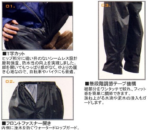 カラーは2種類で、サイズは4種類あります。メンズ・レディース兼用となっています。性能を考えると、コストパフォーマンスに優れているレインパンツです。