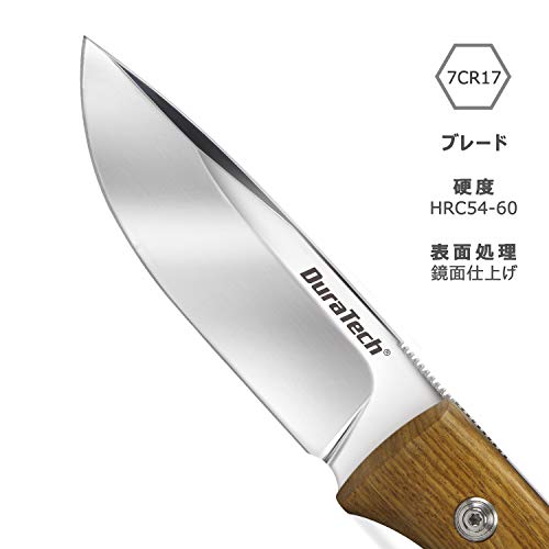 こちらのシースナイフは、グリップ部分に木材を採用。また、刃部分は鏡面加工を行うことにより、錆びづらい仕上がりとなっています。また、フルタング仕様のため、耐久性が高いのもポイントの1つ。