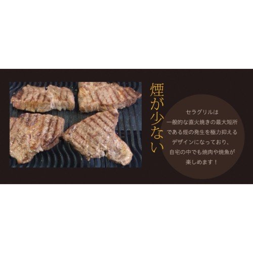 セラミックバーナーの遠赤外線効果により食材を中から焼き上げ、外はこんがり中はジューシーに、炭火に負けない焼き上がりのできるロースターです。バーナーを上部に設置する事で脂などが熱源に落ちない為、煙を抑えて、卓上で美味しく、楽しく遠赤料理機能が付いています。