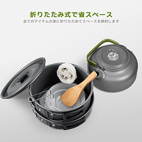 調理器具のみならず、竹べら、ボウル、取り分け用レードル、洗浄用スポンジなども付いてきて、リーズナブルな価格で販売されていますのでコスパが高くおすすめなクッカーセットです。ソロキャンプや登山などのアウトドアシーンに楽に携行できて様々な料理を作ることができます!