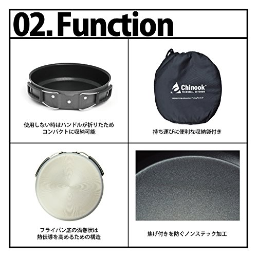 出典: https://www.amazon.co.jp/Chinook-%E3%83%81%E3%83%8C%E3%83%BC%E3%82%AF-%E3%83%8F%E3%83%BC%E3%83%89%E3%82%A2%E3%83%8E%E3%83%80%E3%82%A4%E3%82%BA%E3%83%89-8-5%E3%82%A4%E3%83%B3%E3%83%81-41483/dp/B001HNIN2G/ref=sr_1_19?ie=UTF8&qid=1532822434&sr=8-19&keywords=%E3%82%AF%E3%83%83%E3%82%AB%E3%83%BC%E3%80%80%E3%83%95%E3%83%A9%E3%82%A4%E3%83%91%E3%83%B3料理を作った後の片付けの際には、ハンドル部分をコンパクトに折りたたみできて、専用の収納袋に入れられますので持ち運びにも便利です。ソロキャンプやソロツーリングなどにもスペースを取らず楽に携行できる人気の調理器具です。