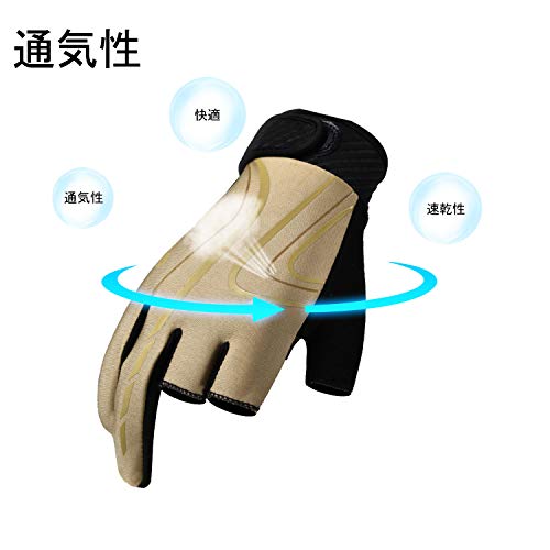 Vgoのフィッシンググローブは、手の平に耐摩耗性のある天然合皮PUを使い、滑り止め強化のために特別なテクスチュア加工をしています。手の甲には軽量かつ通気性に優れたライカ素材を使用し、涼感と速乾性を提供してくれるため、長時間使用しても快適に使用できるグローブです。