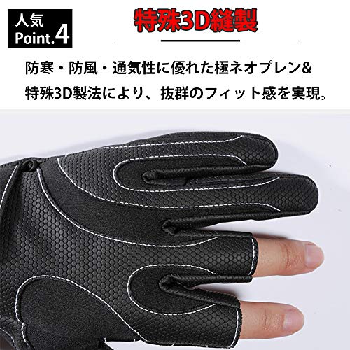 フリーで使える親指と人差し指は、釣りではジグやエサ付けなどに便利で、グローブをしたままスマホの操作などの細かい作業をすることができます。防水性や通気性に優れたネオプレーン生地を使用しているので、春夏秋冬とオールシーズンに対応していますので大人気です。