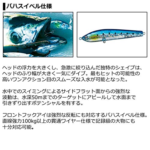 浮力をヘッド付近に集中させ、急激にボディーが絞れていく独特な形状をしたルアーです。水中では一気にダイブしていき、もっともヒット率の高いワンアクション目で青物を誘発します。使い勝手のよいルアーです。