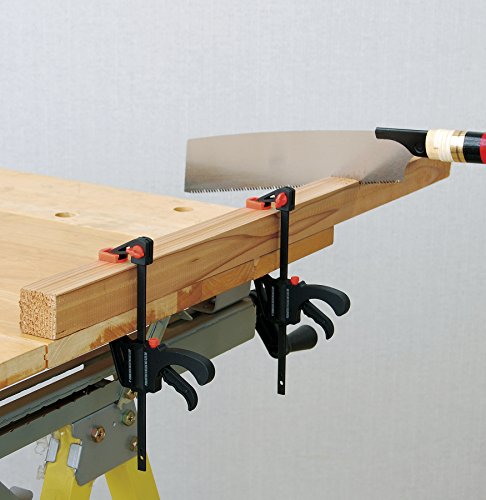 しっかり締め付けて、動かないようにしてのこぎりで切る。接着剤を付けたところが乾くまで固定したい。初心者に限らず、クランプが必要な場面は多々あります。