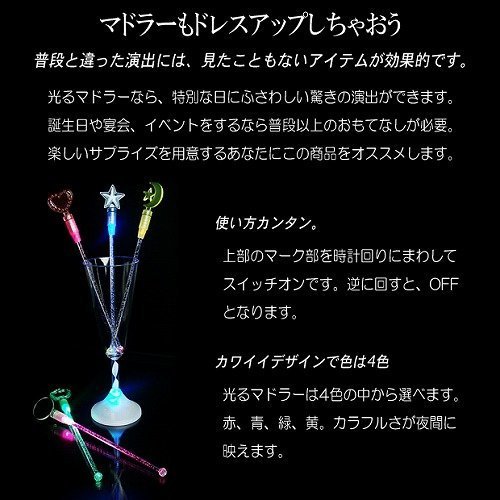 電光ホーム 光るマドラー マドラー LED カラーは名前にもある通り光るので、友達で集まって誕生日会などをする時にとても役に立ちます。サプライズをする時に電光ホーム 光るマドラー マドラー LED カラーがあると、より雰囲気が良くなります。その他にはケーキの日を消すために電気を消した時に、光を付けていればコップやお皿がどこにあるかをすぐに把握できて、手がぶつかるなどして誤ってテーブルから落とす事も避けられます。