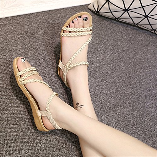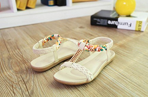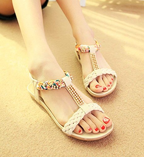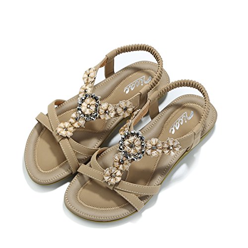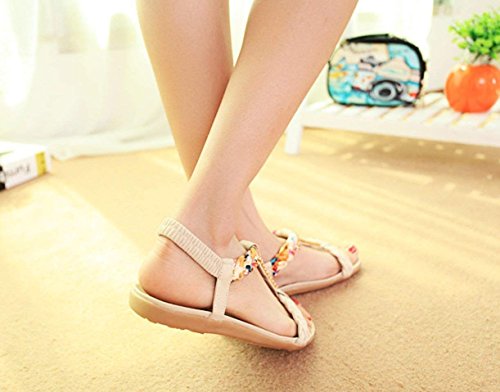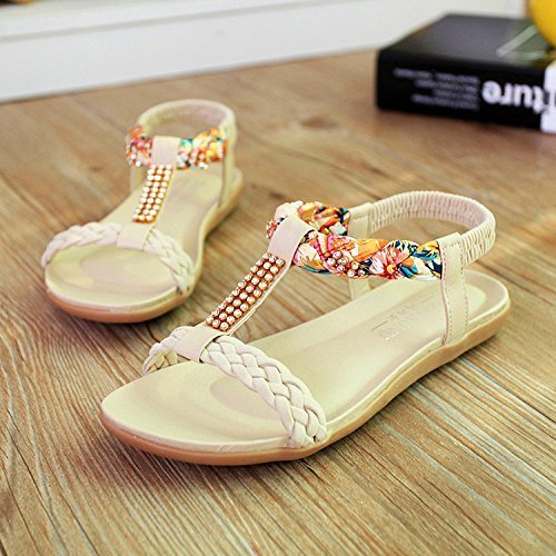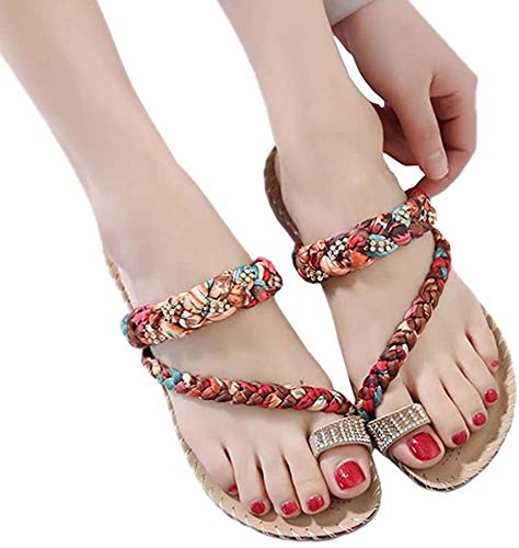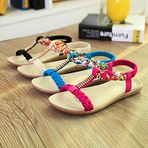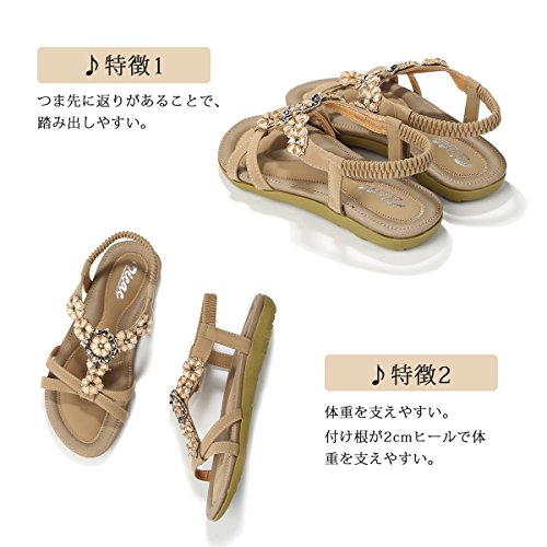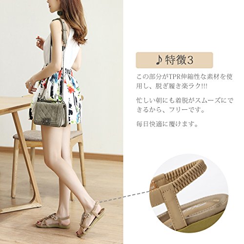 夏らしい爽やかなカラーの小粒ビジューをアンクルストラップにあしらっているおしゃれなボヘミアン調のレディースサンダルで、親指を固定できるようになっていますので履きやすいです。
