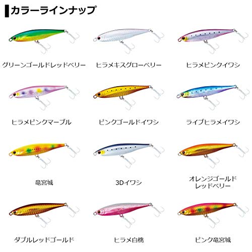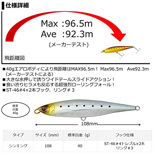 108mm40g、フックセッティングは他モデルと同じ#4になっています。ダイワテストでの飛距離はアベレージで92.3mを記録。メタルジグクラスの飛距離と、浮き上がりによるスローなアクションのコンセプトを、バッチリ体感できるスペックです。MAX40gのロッドよりもやや余裕の持てるロッドの方が投げやすいので、お持ちのロッドと相談しながら検討してみてください。