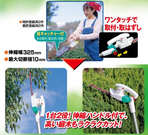 伸縮ハンドルはワンタッチで簡単に取り外せる構造となっていますので、近くの庭木の剪定作業も楽に行う事が出来る2WAY仕様なので利便性が高く、口コミでの人気も高い高枝切りバサミです。特殊コーティングが施されているメッキ刃を採用していて切れ味も鋭く、両刃が一緒に駆動するようになっていますので、太さのある枝も楽々切断する事ができます。低振動、低騒音ながらも素早い刈り込みスピードを持っています。