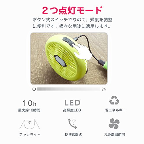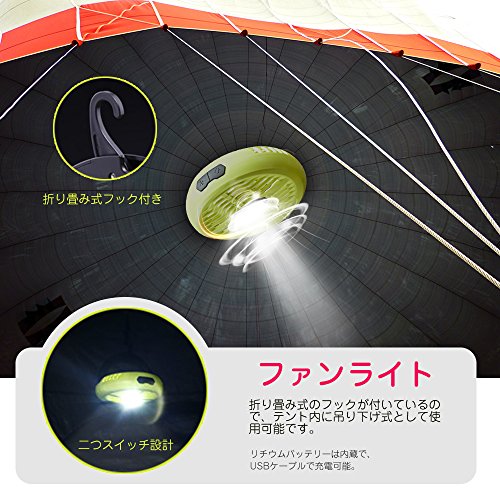 こちらは扇風機付きなので、テントランタンにおすすめ!真夏のキャンプで蒸し暑くなるテント内の空気を、循環させることができる最強アイテムです。USB充電が可能で、フル充電で4~10時間持続利用が可能。