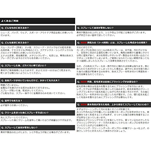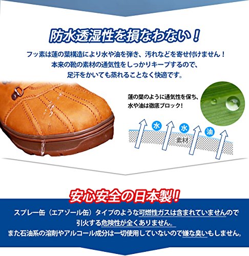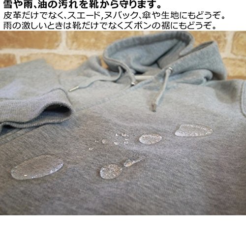 スムース・スエードレザーを素材に用いた靴をはじめ、カバンや傘など様々な革製品の表面部分へと吹きかけるだけで、表面に皮膜を作って強力な撥水効果を得る事ができ、雨天時も安心して靴を履く事ができます。
