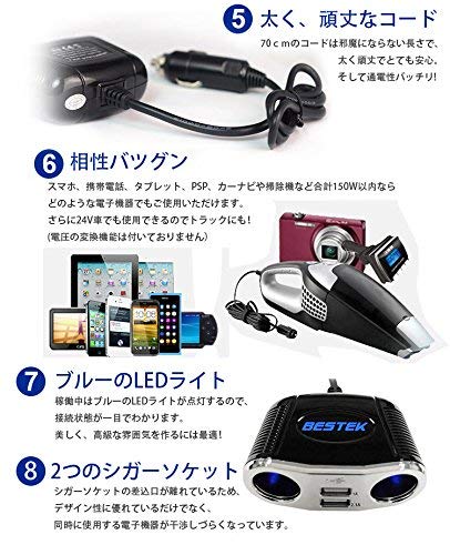 BESTEK シガーソケット 車載電源充電器 2連 USB 2ポート 12V/24V車対応 LED付き MRS152UVには2つのUSBポートが付いていて、スマートフォンや音楽機器などを同時に充電できます。特に家族や友達と車中泊している時に便利で、他の人のスマートフォンの充電が完了する事を待たなくても良くなります。出力の大きさは150Wになっていて、一般的な製品のW数は70ぐらいなので非常に高いです。