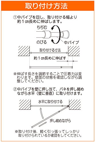 出典: https://www.amazon.co.jp/%E5%B9%B3%E5%AE%89%E4%BC%B8%E9%8A%85%E5%B7%A5%E6%A5%AD-%E8%80%90%E8%8D%B7%E9%87%8D2kg-%E5%B9%8513-16cm-%E3%83%91%E3%82%A4%E3%83%97%E7%9B%B4%E5%BE%841-3%E3%83%BB1-0cm-SMP-11/dp/B00C1STDC0/ref=sr_1_8?ie=UTF8&qid=1535030574&sr=8-8&keywords=%E7%AA%81%E3%81%A3%E5%BC%B5%E3%82%8A%E6%A3%92%E3%80%80%E5%BC%B7%E5%8A%9B%E3%80%80%E7%9F%AD%E3%81%84こちらは、ネジ不要の中バネ式の突っ張り棒になっています。短いと取り付けるのが難しいので、ちょっとしたコツを。まず、取り付ける隙間よりも1センチほど大きい長さに固定してから、グッと押し込み隙間に差し込んでみてください。このやり方なら簡単に手早く短い突っ張り棒を設置することが可能になりますよ。