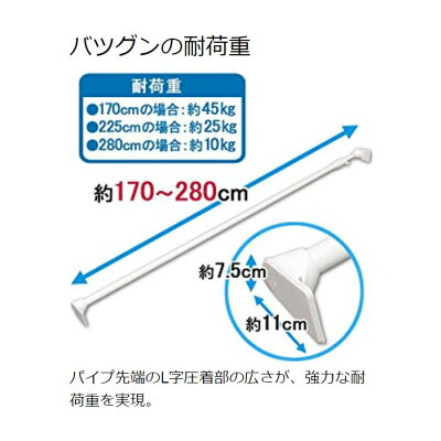 出典: https://www.amazon.co.jp/%E5%B9%B3%E5%AE%89%E4%BC%B8%E9%8A%85%E5%B7%A5%E6%A5%AD-NGP-110-%E5%B9%B3%E5%AE%89%E4%BC%B8%E9%8A%85-%E7%AA%81%E3%81%B1%E3%82%8A%E3%82%B9%E3%83%BC%E3%83%91%E3%83%BC%E6%A5%B5%E5%A4%AA%E3%83%9D%E3%83%BC%E3%83%AB-%E5%A4%A7/dp/B002UVMQOK/ref=sr_1_4?s=home&ie=UTF8&qid=1535030012&sr=1-4&keywords=%E7%AA%81%E3%81%A3%E5%BC%B5%E3%82%8A%E6%A3%92&th=1パイプは太い方が支えられる重量がアップします。極太タイプのパイプだから実現できた、最大重量65kgという数字は圧巻です。また、壁と接するパーツも内蔵のバネとパーツのヒンジ効果で下方向への力がかかっても強力に耐えます。