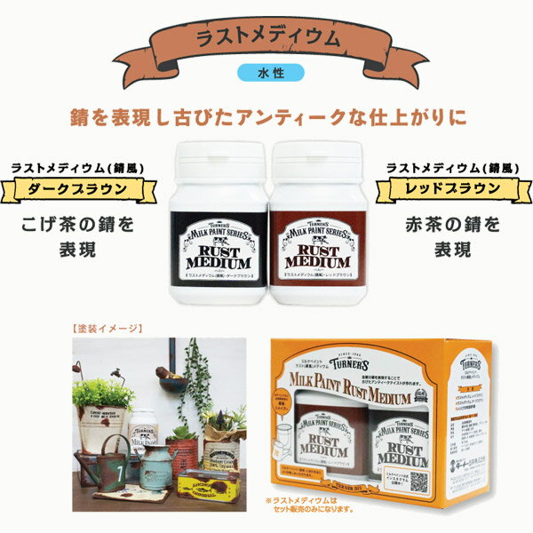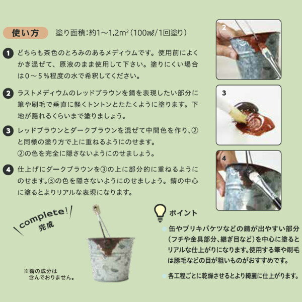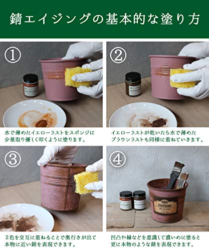リアルな錆の塗装をするためにベース色のブラウンとエイジング用のイエローに分かれています。2色を使い分けてよりリアルな錆塗装を目指しましょう。水性の塗料ですが乾けばみずがかかっても大丈夫ですよ。50gづつ2本と少なめの容量なので小物や模型の錆塗装をするのにちょうどいいですね。