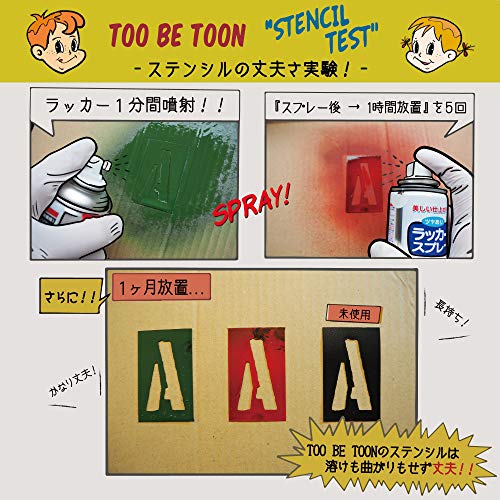 文字のステンシルシートもあります。1文字ずつ分かれているので好きな単語を作ることができますね。例えばミリタリー風なら「AIR FORCE」「P-028」「.38652」などペイントするとぐっとミリタリー感がでますね。「P-028」は適当な文字列ですが「AIR FORCE」などの単語はスペルを間違えないように注意して使いましょう。