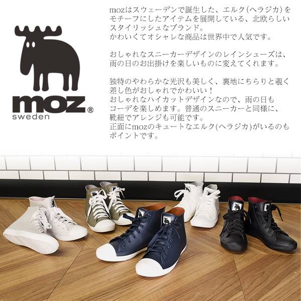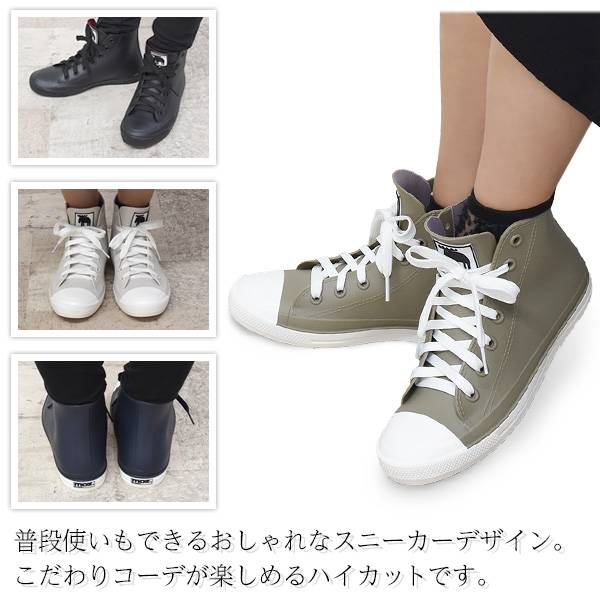 こちらのハイカットレインスニーカーは、MOZから販売されているものです。レースアップを採用しており、自分の足のサイズに合わせて調節可能。また、カラーバリエーションが豊富なので、自分好みのものを見つけられます。