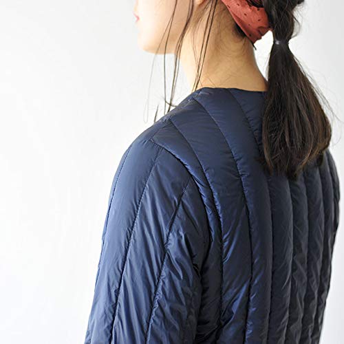 膝丈程まで長さがあり、薄いながらも保温性に優れていて軽量なレディース用人気インナーダウンコートになります。すっきりとしたシルエットのコートになりますので、アウターとも着こなしが簡単です。更に襟なしデザインなので、首元に圧迫感が少なく快適に着用することが出来ます。
