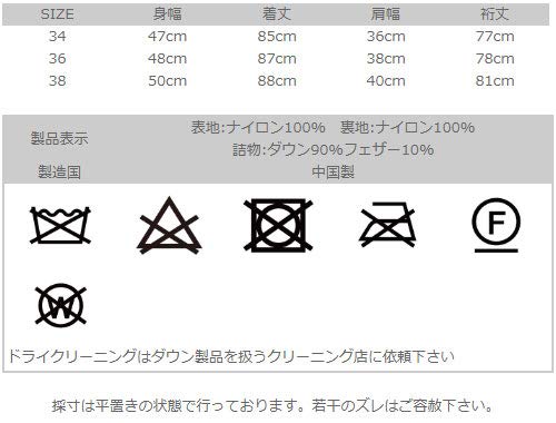 インナーダウンのサイズ / 34 総丈 / 61cm, 肩幅36, 身幅51cm/サイズ / 36 総丈62.5cm, 肩幅37, 身幅 / 53cm